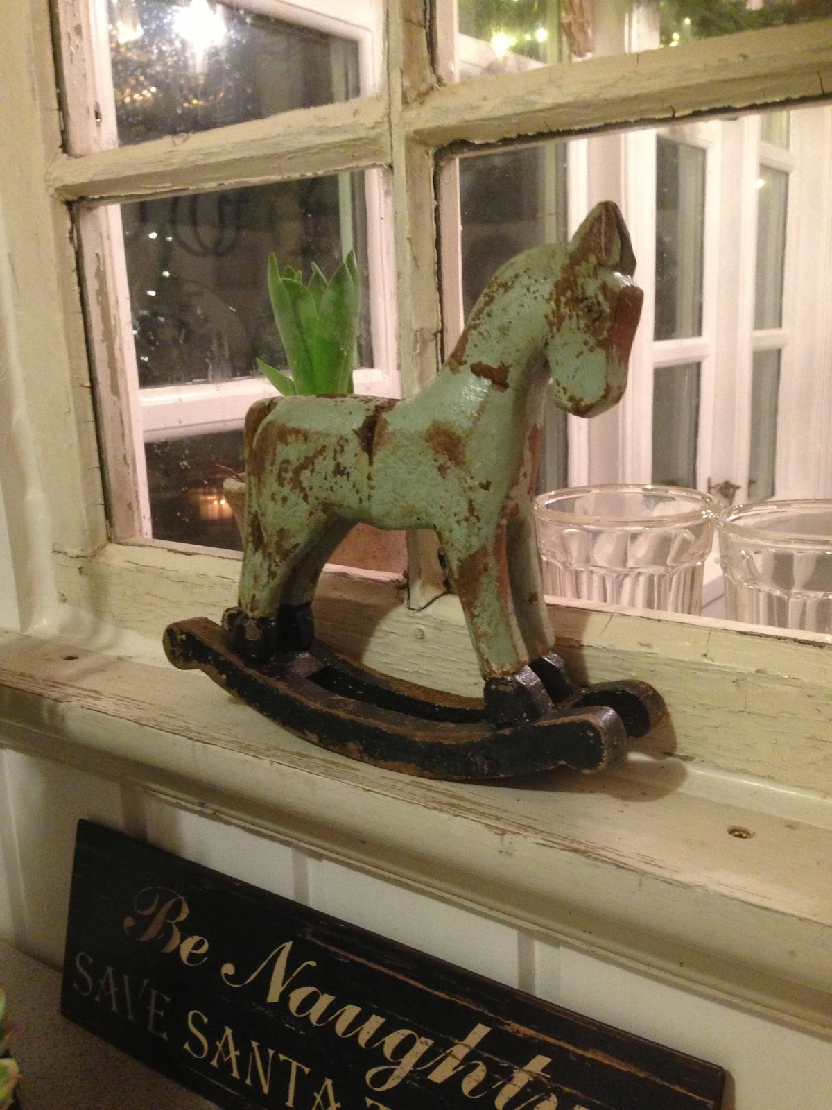 I det ene hjørne af køkkenbordet i skurvognen, har jeg lavet et lille stilleben med en kasse, med nødder, kvæder, husløg og grønt. I det lille vindue står en trægyngehest. På den anden side af vinduet, står små glas til lys og en hyacint. Et lille hyggeligt arrangement, som øjnene hviler på, når man træder ind af døren.